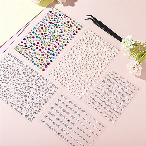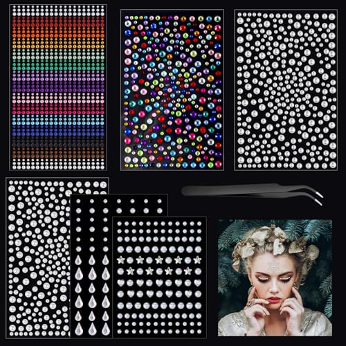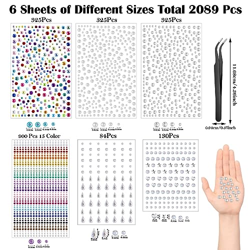 - 【Package Included】You will get 6 face jewels stick on (1 transparent round rhinestone sticker, 1 pearl sticker, 1 colorful rhinestone sticker, 1 water drop gem sticker, 1 heart star sticker, one 15 color rhinestone stickers) and a pair of tweezers. A total of 2089 face stones, available in various sizes of 3mm, 4mm, 5mm, 6mm, convenient for you to use in makeup and DIY decoration.