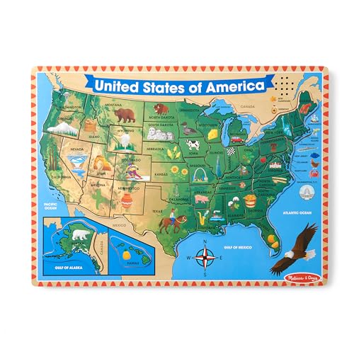 Amplify your child’s learning and play experience with this fabulous U.S.A. Map Sound Puzzle. As each piece is placed correctly in the puzzle board, your child will be delighted to hear the name of that state’s capital. Colorful illustrations on the map pieces depict images associated with that state, and under each piece you can see an outline of the state’s border. It includes 40 puzzle pieces made of top-quality wood to ensure durability and longevity. This Melissa & Doug sound puzzle provides kids with a great introduction to the states while they practice motor skills, hand-eye coordination, and problem-solving skills. It makes an exceptional gift for boys and girls ages five and older for hands-on, screen-free play. (TIP: Puzzle has light activated sensors; for best results, expose the sensor by removing a piece in a brightly lit room, then make the sound play by replacing the piece in the board.)