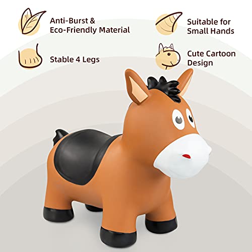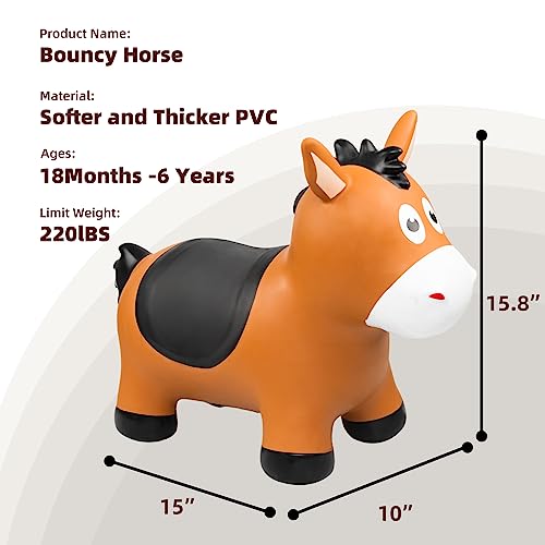 - [NEW BOUNCY HORSE TOYS] Featuring an original and unique design, this inflatable horse has a cartoon shape with cute facial expressions, big eyes, a flowing mane, a brown saddle, and a vigorous posture. It allows toddlers to bounce and ride a horse like little jockeys, creating endless fun. Perfect as outdoor ride on toys for toddlers 1-3, it’s a delightful addition to their playtime. Recommended Age: 18 Months+