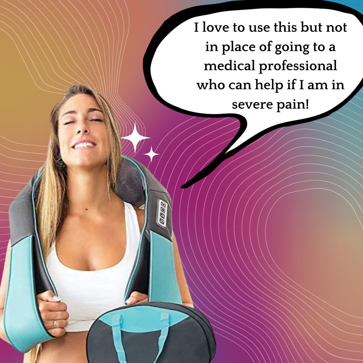 A few notes: If you have major neck and back pain or major neck and back problems, please do not use this massager before you check with your doctor. This is a nice stand in after a long stressful day or intense workout. It is not something you can use in place of professional medical care. Do I think you already knew that? Yes. Do I still have to say it? Yes.