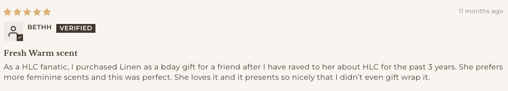 I personally despise linen-scented things (too…laundry-y!) and told Lindsay at HLC to not take it personally if I wasn’t recommending it to Geezers. Then I smelled it and had to eat my words. It’s literally my favorite non-holiday candle.