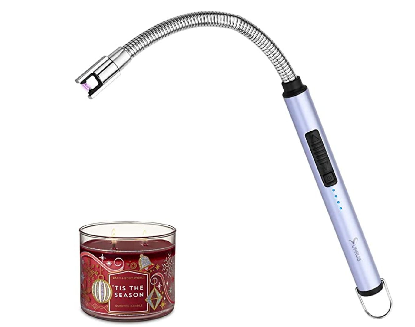 The one I bought: Candle Lighter SUPRUS Rechargeable Electric Arc Lighter Triple Safety Long Lighter Stainless Steel Shell & Hanging Hook with 360°Flexible Neck (Green). Love the name. Rolls right off the tongue.