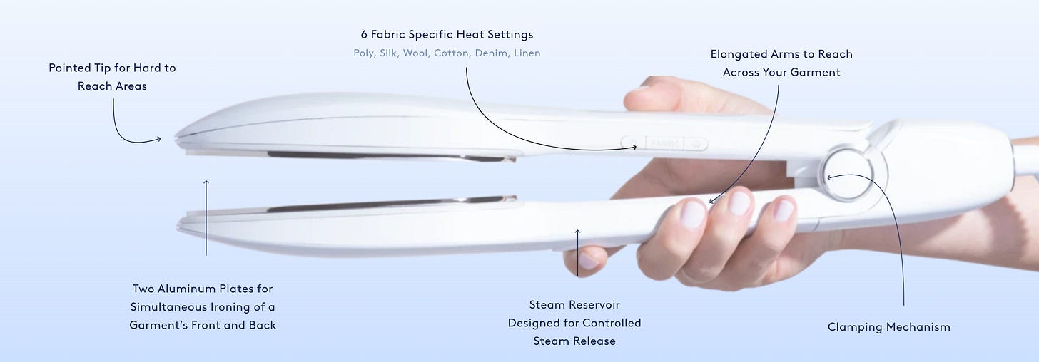 While you certainly can use it to iron your sheets, the Nori is best for smaller items like tops, dresses, shirt collars, and crushed hemlines. Plus, it’s a plug-in tool so it can hang out in your carry-on luggage no problem. It has a steam setting and a little spout for water or Nori’s Fabric Facial solution (full disclosure: I haven’t tried the solution!).