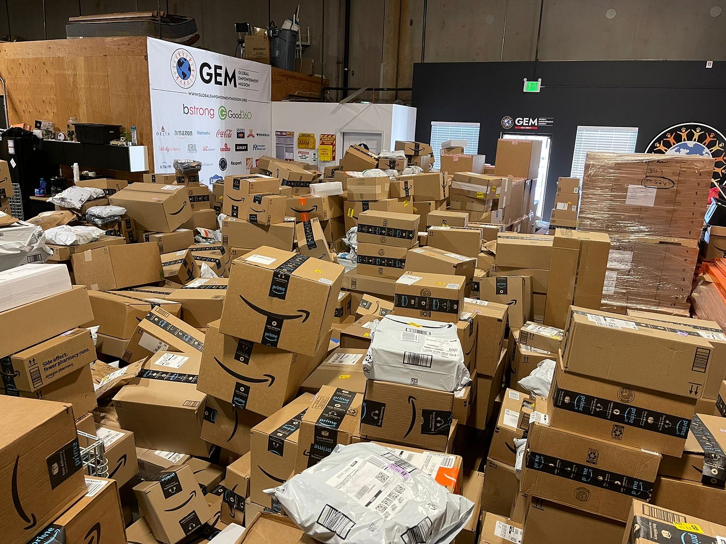Geezers were also responsible for sending high quantities of a handful of specific and requested items from an Amazon wishlist to the Global Empowerment Mission warehouses in Chico, CA and in my old neighborhood of Glassell Park in LA. Above is a video our partner Shelly from Pandemic of Love sent me from the GEM distribution center in Pasadena. It made me smile.