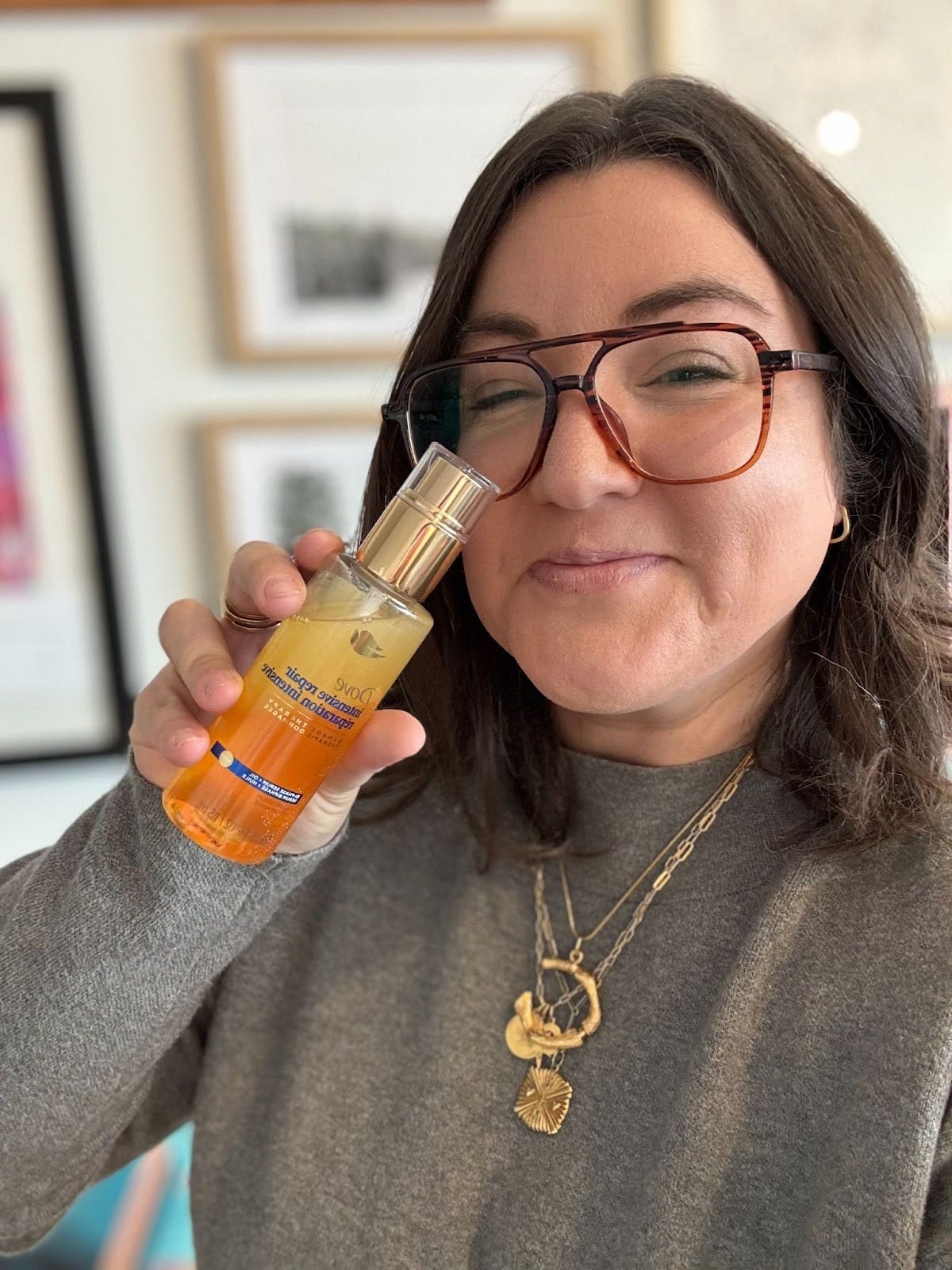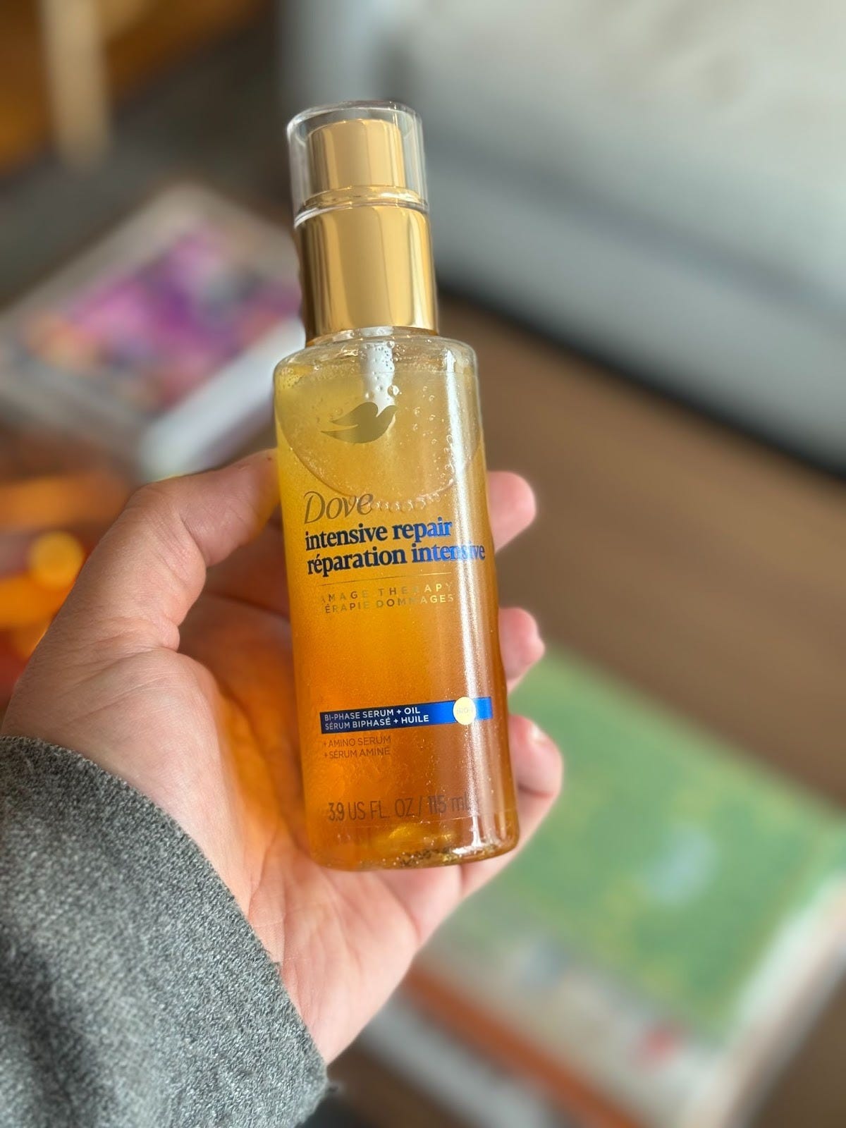 The other product I added (and kept reaching for all month) is the Dove Intensive Repair Bi-Phase Serum + Oil, even though most oils and serums have historically been big fails for my thick, wavy hair that gets very oily by day two. Most serums make my hair feel heavy, weighed down, or weirdly slimy, which immediately sends me running for the shower. Hard pass.