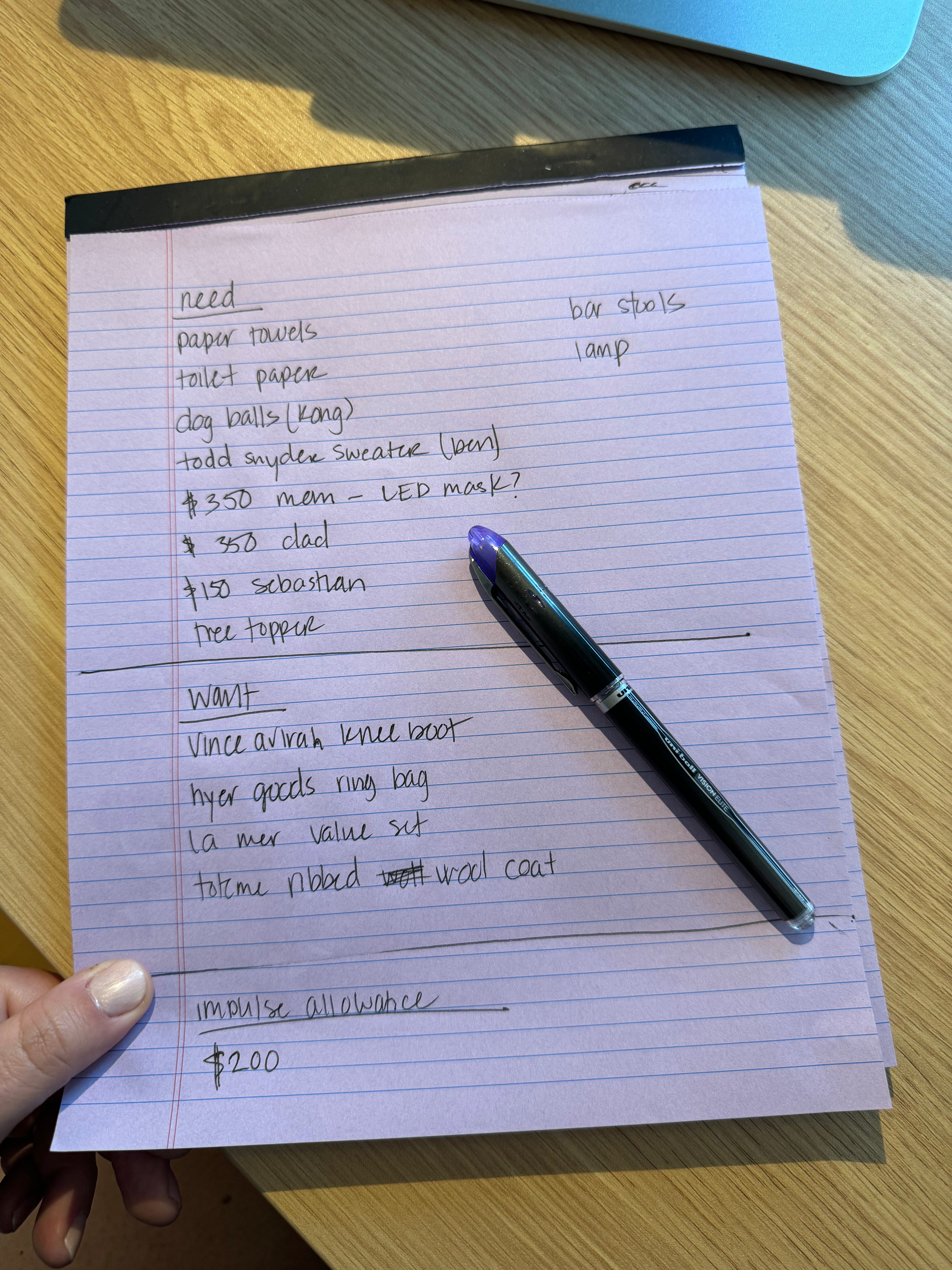 I make two lists. One is a “what I need” list and one is a “what I want” list. On the need list: gifts for my family (if I don’t have a specific idea of the product I’m looking to buy them, I make sure to write down the max price I am willing to pay for whatever gift I land on), host/ess gifts, and what I need for my household like detergent, dishwasher pods, garbage bags and paper goods. The latter isn’t sexy, but usually a retailer like Target will offer a $15 gift card when you spend $50 on a category like cleaning supplies.