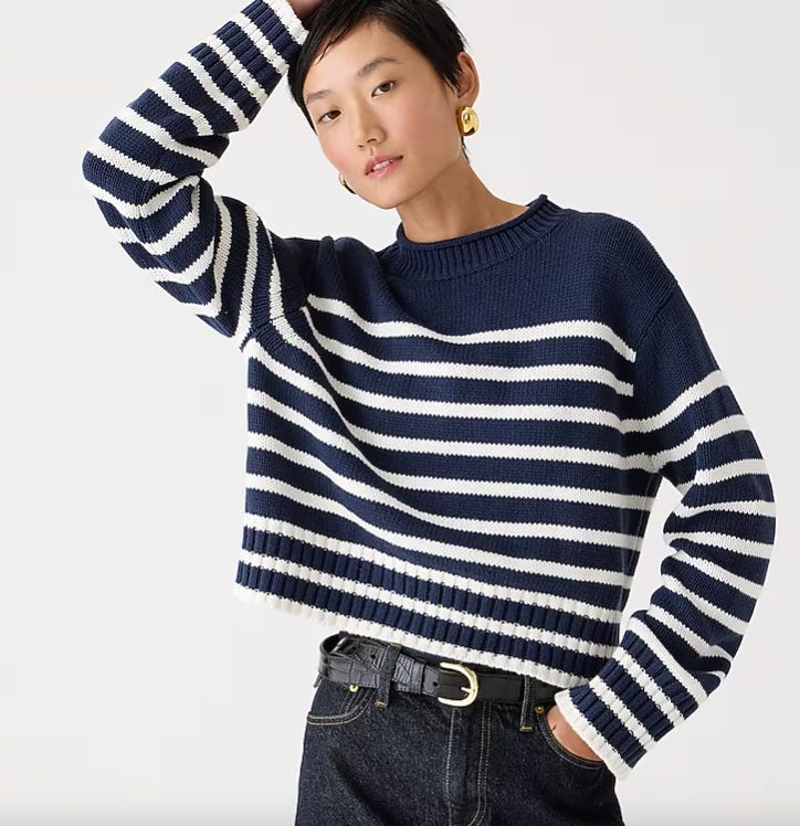 A few of our favorite closet staples, like the rollneck striped sweater, have been marked down and can be stacked with code EXTRA. I find that this sweater fits in my most typical size, but if you like a looser fit, size up and you’ll be fine.