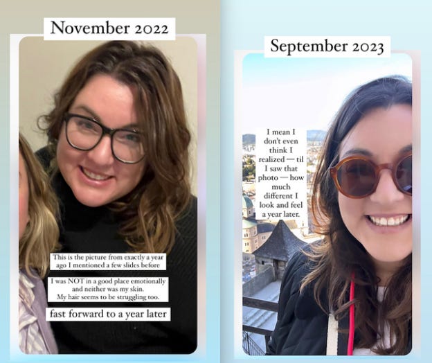 I started using the Series 1 mask in May 2023, and here’s a comparison (also note: Zoloft helped in the making of this glow up, but I also credit the mask!):