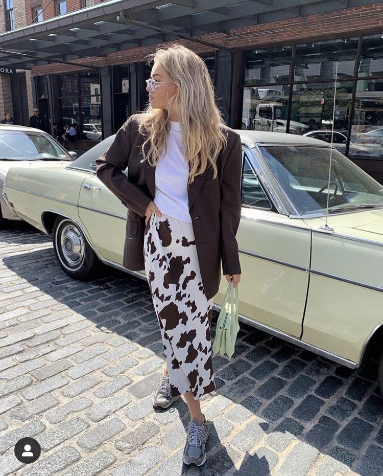 We’re going to play with this right now, actually, as we explore Fall’s hottest trend: cow print. Leopard print also, yes, but cow is really having it’s moo-ment. It’s bold, but less “loud” than some other prints. Vogue calls it “the sleek alternative to leopard” which, I mean, okay. Go all in with a big statement piece or sneak it in as a little accent. The neutral (or MOO-tral, I’m here all week!) palette of white, cream, and brown means it plays nice with basically every autumnal color and texture. Black and white? Sure, yes, but I would stay away from it in the context of outfits or else you may serve Halloween. The black and white also somehow cheapens the pattern in a way that brown and cream do not, IMO. If you are nervous about incorporating the print into an outfit, start from the bottom up, not the top down. Pants over tops, skirts over jackets. And if you really want to play it safe, go with belts, bags or shoes before you buy a piece of clothing.