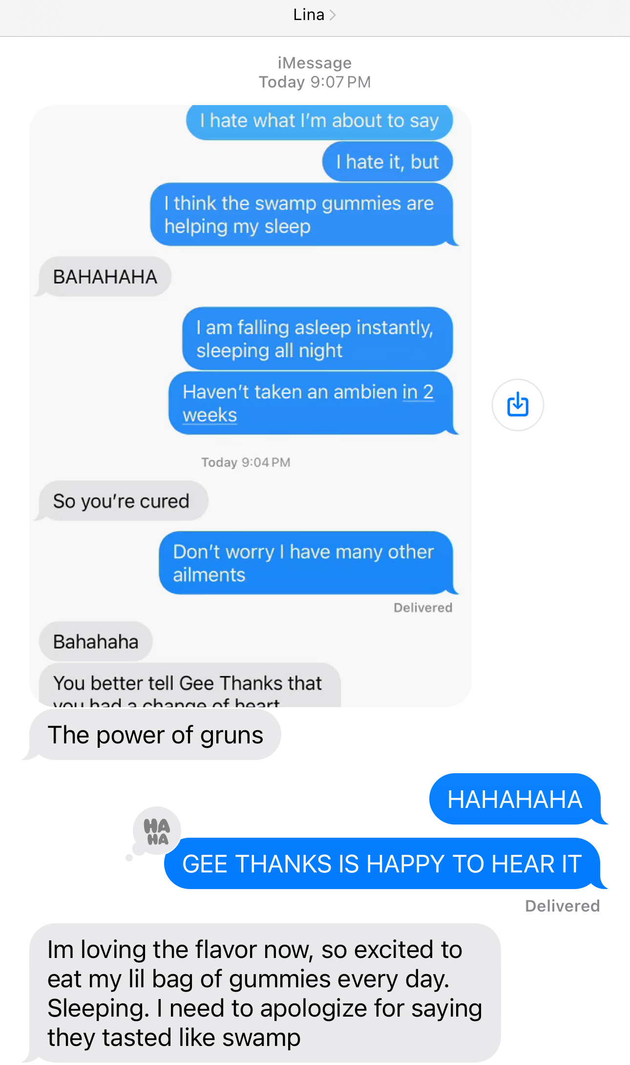 Except…one Geezer, Lina, was the first person in my DMs who said she didn’t like the taste. All good — there’s not a product on earth that can satisfy every single person. Then I got this text from her.