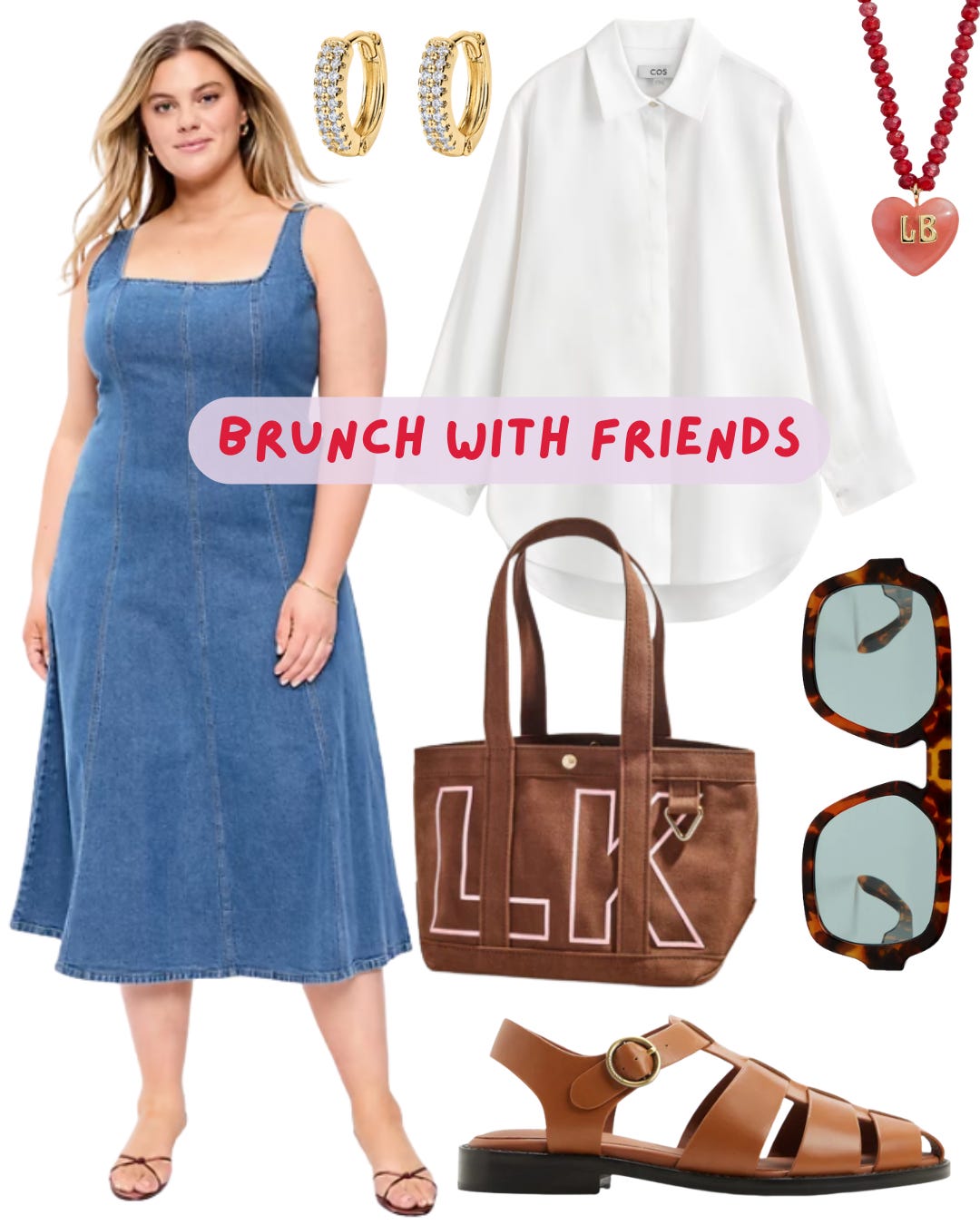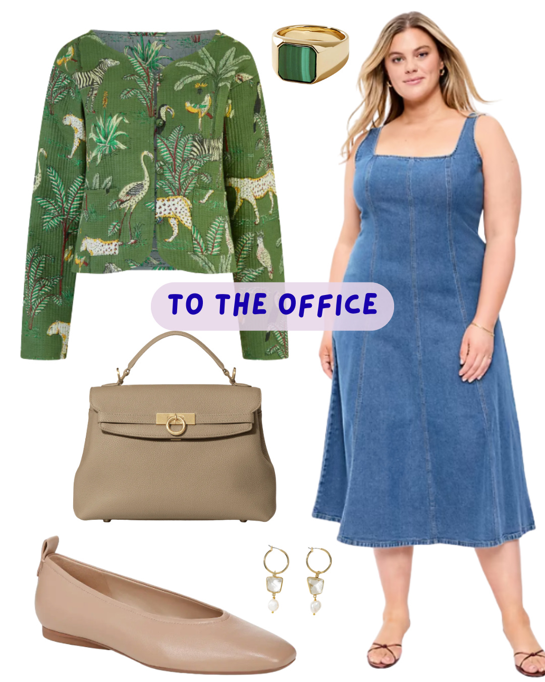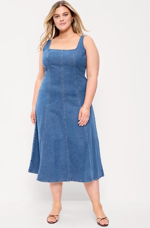 It’s a sleeveless denim midi dress that gives structured ease. It has a square neckline and thick straps, which make it feel more elevated and less casual than your average denim dress. It’s totally work appropriate if paired with the right shoes and cardigan.