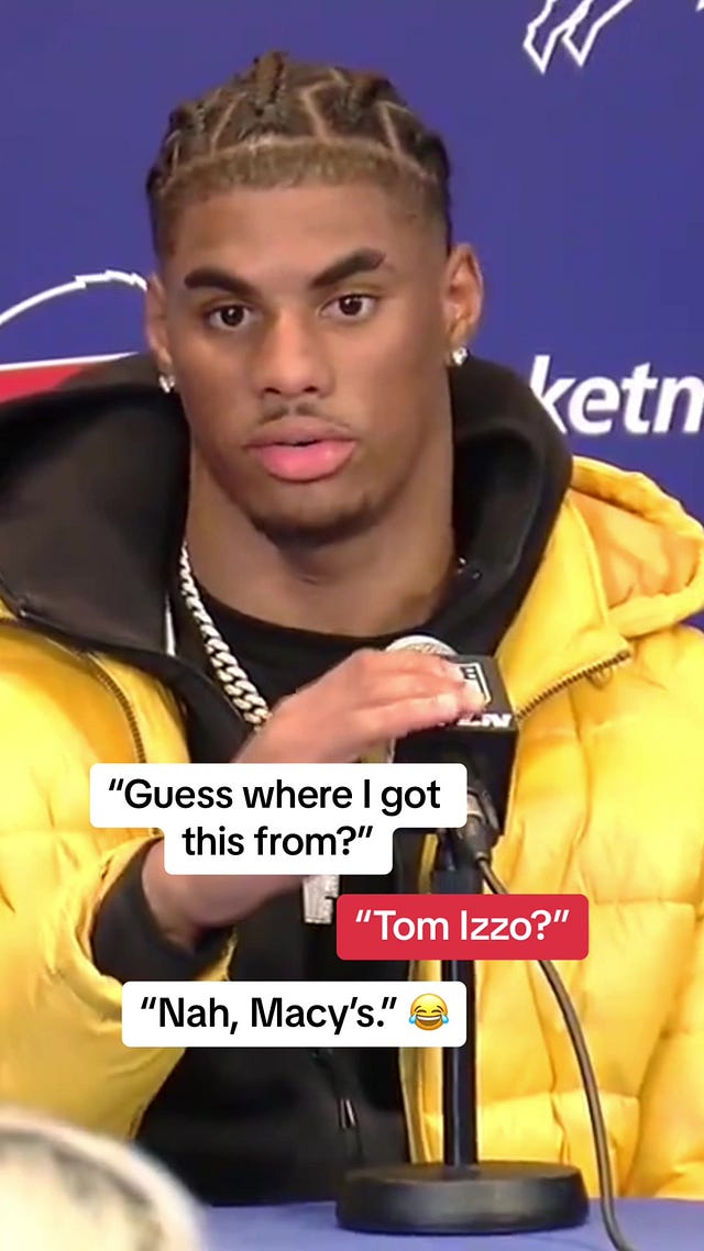 One of the ways I deal with summer is getting my cooler weather wardrobe ready for a fraction of the price. You know what goes on MAJOR sale when global warming shows up? Coats, jackets and sweaters. My three favorite things to buy. Just ask Bills rookie Keon Coleman. He knows! His mom knows!