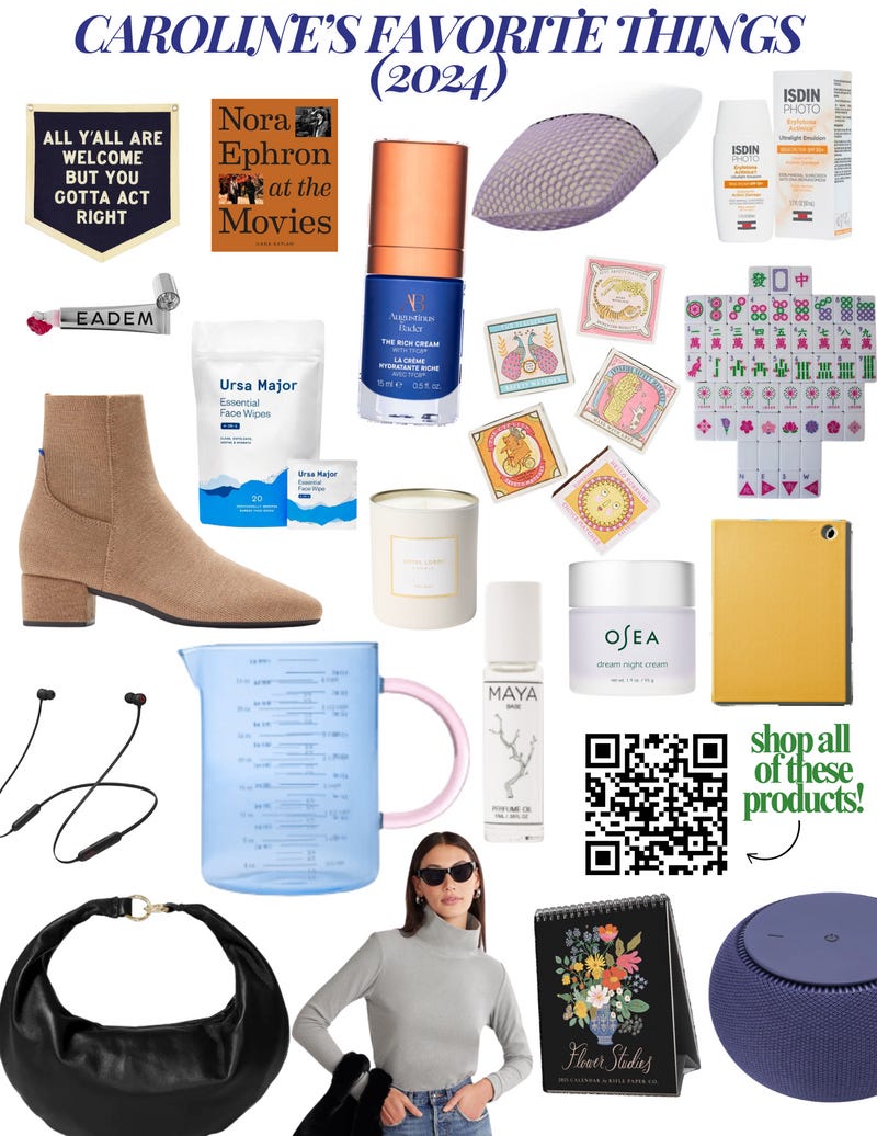 As a bonus, I included last year’s Geezer-Approved and Caroline’s Favs list, too. I still stand by all of the recs: The coffee maker you guys won’t shut up about in my DMs, the karaoke mic kids and adults fight over at holiday gatherings, (still) my fav PJs, the comfiest flats (especially for the size 11 girlies), and my parents’ beloved countertop grill. Travel and tech? AirFly for using AirPods on planes makes the list for the 4th year in a row, the clear Calpak case that keeps your skincare organized, and little luxuries like a fancy pepper mill and the pumpkin candle that makes my home memorable to all of my guests.